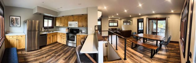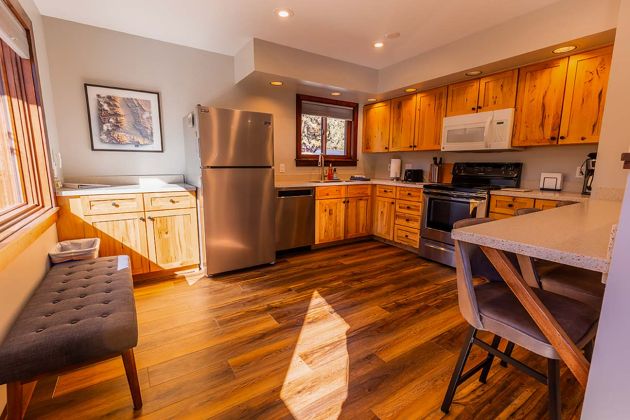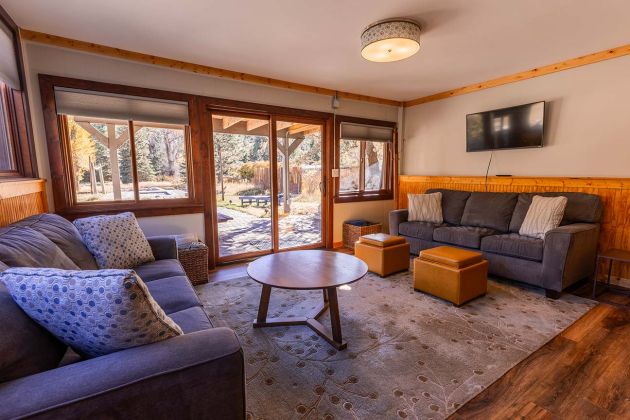 This two-story chalet is tastefully decorated with comfort in mind. The upstairs has 2 bedrooms each with full bathrooms. The kitchen and the main living area extend onto the deck with iconic views! Downstairs are two queen beds, a bathroom, and sitting area that opens up to the pool and meadow.
