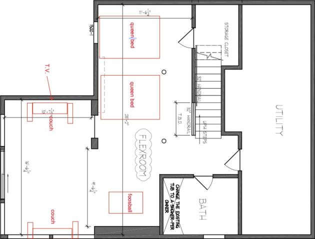 2 Queen beds and sitting area with a foosball table downstairs opening up to the pool and a meadow