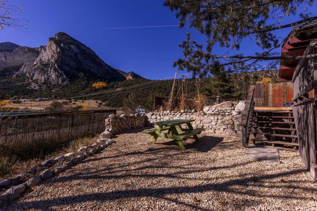 Our 1,900 square-foot mountain chalet is great for families or those who want a little more space. Situated in a peaceful setting with stellar views, the chalet opens on the back to two acres along Chalk Creek with a natural meadow to explore. The private hot spring pool sits just at the base of the stunning Chalk Cliffs, a geological wonder in Colorado.